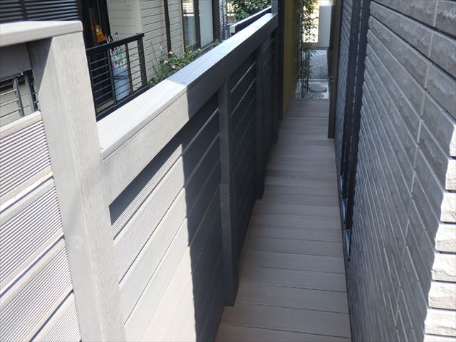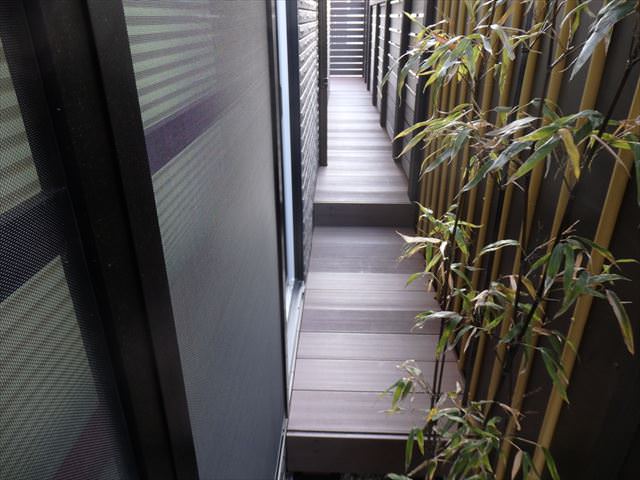 なく通路として細いウッドデッキを裏側のリビング掃き出し窓まで伸ばす施工も