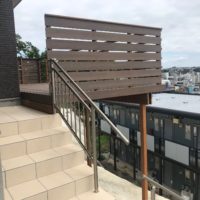 横浜市などの丘陵地帯では新規の住宅地は山の上の斜面を宅地として開発するケースが多く見受けられますが、日々の生活に多少不便な反面今回のケースのような眺望という特典が付くケースがあります。まずデザインついてですが、こちらの施工例の場合は側面はプライバシーを重視して目隠し横張りフェンスにしましたが正面は開放感重視のルーバーフェンスです。素材についてはウッドデッキの床材はアールウッド色オールナット、フェンスはアールウッドオールナットにアールウッドブラウンの角材を使用しております。シンプルですが質感の高い仕上がりでお客様も大変満足されました。