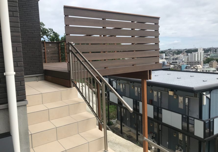 法面にもウッドデッキが合います。 2020年5月横浜市で施工した物件のご紹介です。施主は物件購入時より弊社に相談に来店されました。数社の施工業者に相談されましたが、急斜面の為躊躇されたようで最終的に弊社が請け負う事になり…..