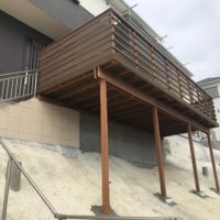 今回のケースのような新築で法面にウッドデッキを作る場合多くのお客様が考えるのが耐久性と災害などに対する安心感と思われます。簡単に作り替えることもできませんので基礎などはしっかりと杭を打ち込んでおります。構造材は耐久性や強度でお馴染みのハードウッド、イぺ、ウリンです。法面という不安定な設置環境でもしっかりした構造で施工しております。また施工する弊社も安全面を慎重に考慮して現場に臨んでおります。