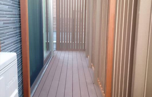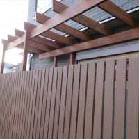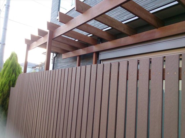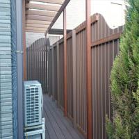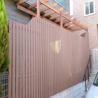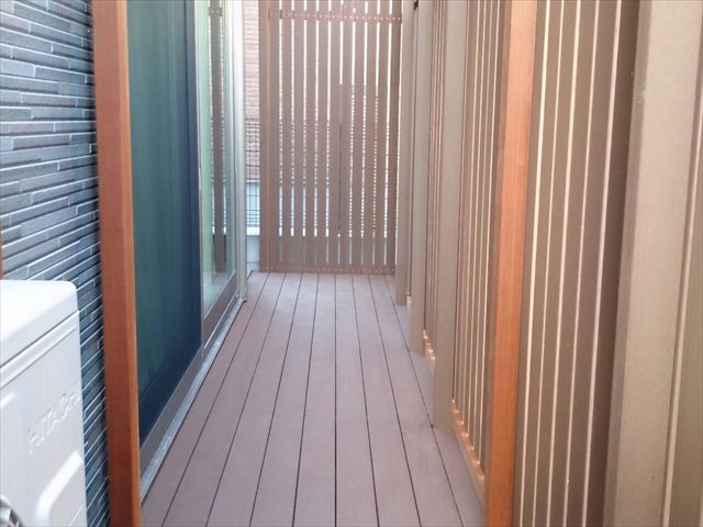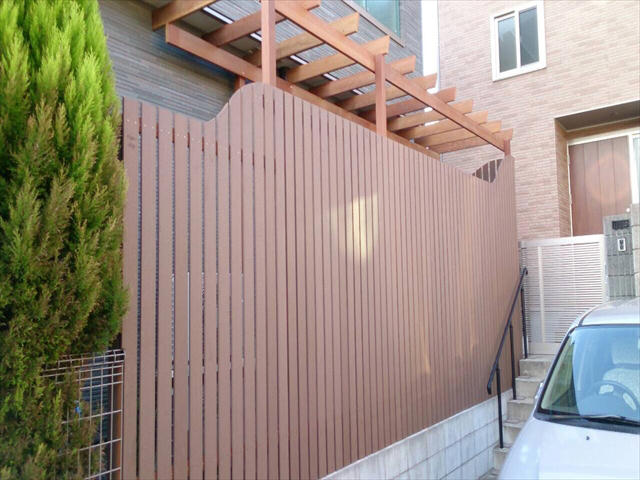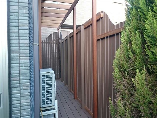 今回の物件もお部屋と出幅120センチの庭先目の前が、地主さんの玄関先に向かうアプローチ。そしてその玄関先は、庭を見下ろせる1段高い位置にあるため、関係が良く生活していても、やはりお互い視線の送り先を気にする状態を解消するために、背の高い目隠しフェンスの設定をしました。今回のフェンスは、弊社でも人気の高いウェーブ(波型)フェンスを人工木で採用・施工しました。