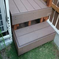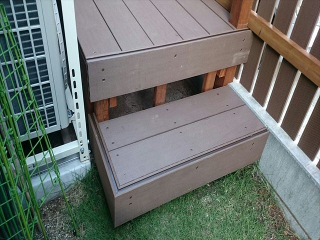 お部屋からデッキの床板、そして地続きの庭へのアクセス動線上、地面までの高さが50センチほどあります。その段差のままではアクセスが大変であるため、ステップも設置しています。サイズは室外機設置フレームに当たらないように現場合わせで作っているので、影響ありません。完成品を設置する方法ではないので、こういった部分もご希望に合わせることができるのです。