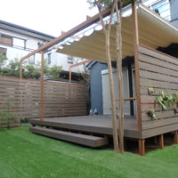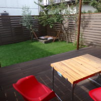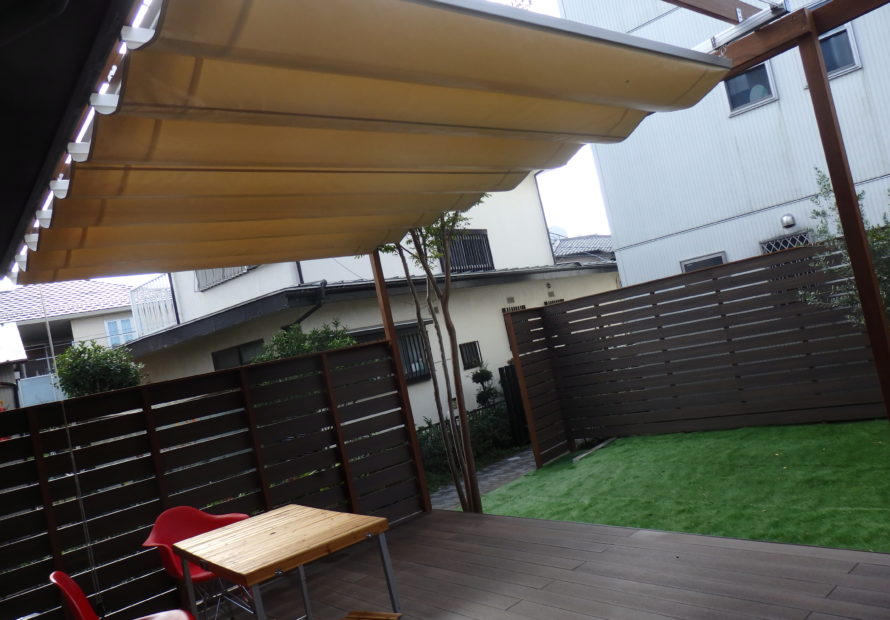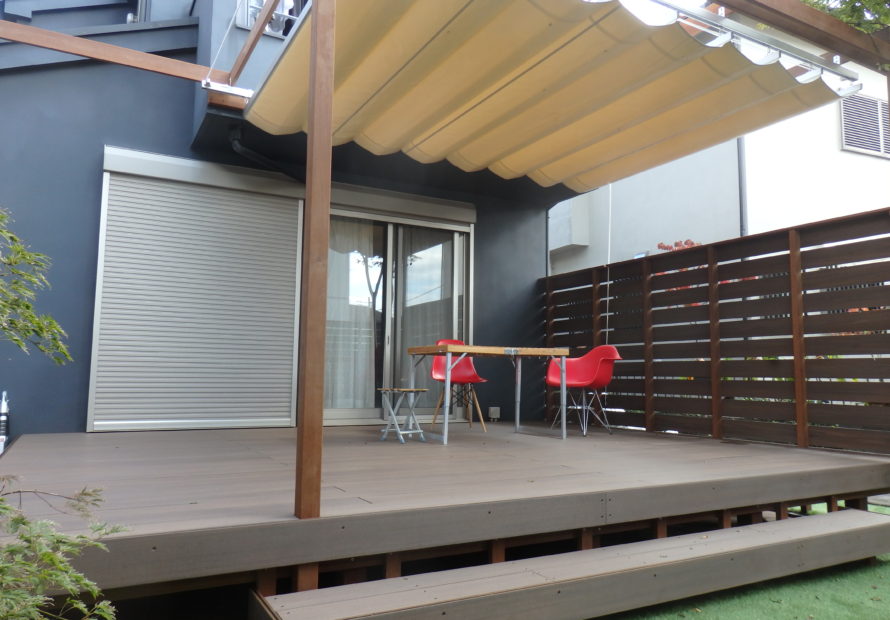 最近定着しつつあるガーデンリビングという言葉がありますが、文字通り庭にリビングのようなくつろぎのある空間を作る事です。ウッドデッキはまさにのような消費マインドで伸びてきた商品といえます。特に最近はステイホームと言う時流もあり庭の在り方を考える時間が増えたようです。従来庭とは歳月と手間をかけて作りあげていくのが日本の伝統でした。現代では在宅とはいえ仕事に忙しく追われているのが一般的の方の日常で、家にいてもゆっくり庭いじりとはいかないものです。今回の施工例は弊社でも良くご要望となるメンテナンスフリーとプライバシーが基本的は提案になります。つまりウッドデッキやフェンスは人工木、芝は人工芝そしてプライバシーは目隠しフェンスと日よけのオーニングです。