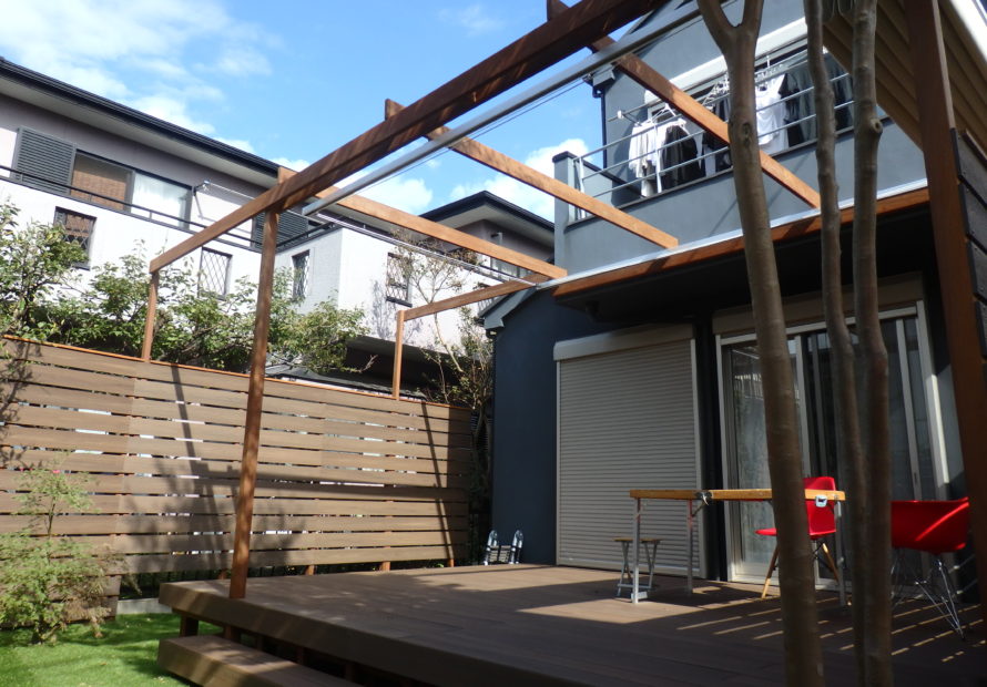 そこで庭を思いきってリフォームするご相談をいただきました。既にお客様の中では植木の多くを処分して高さのある目隠しフェンスで周囲を囲う計画でした。また庭にリビングのような落ち着く空間を作りたいとのご希望がありました。そこでパーゴラとオーニングテントのあるウッドデッキ、空間の仕切りである目隠しフェンスをご提案しました。植木はシンボルツリーとおきにいりの低木以外はすべて伐採し外周部は高めの目隠しフェンスで囲むことでプライベートな空間を作りだし、デッキは屋根にもなるオーニングテントでさらに部屋のようなイメージ作りをしました。玄関アプローチの開口部は大きくとることで圧迫感のないデザインになりました。また当初は計画の中になかった芝の件もメンテナンスフリーな人工芝にすべて張り替えをご提案しました。