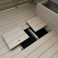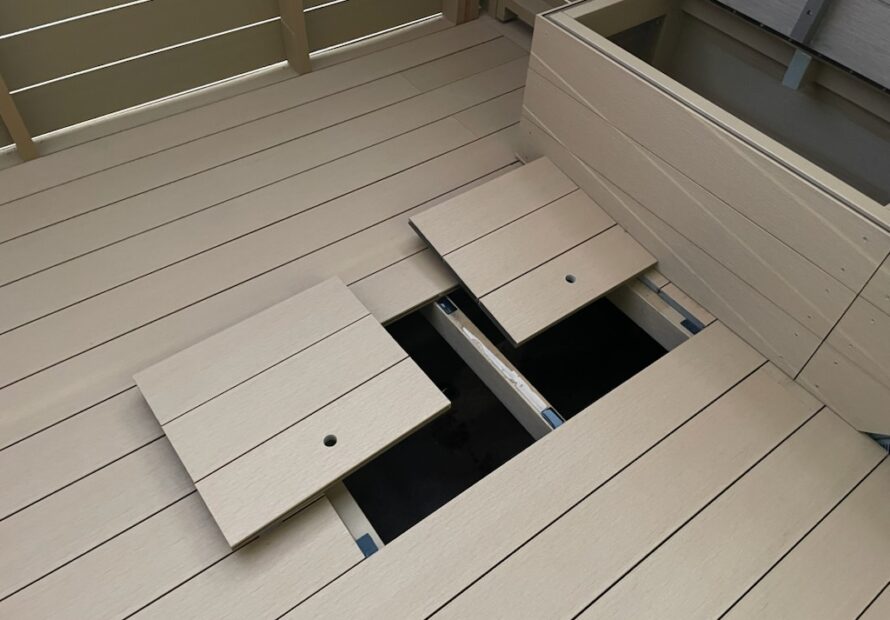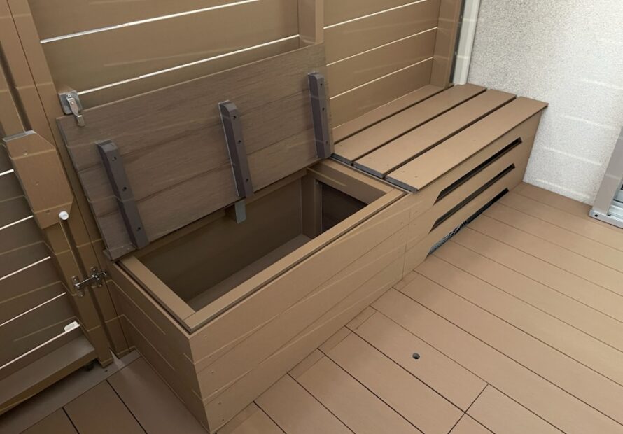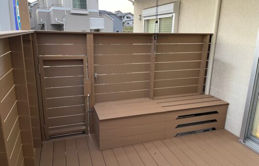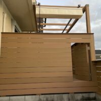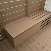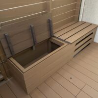 今回の施主様はご計画当初よりアールウッドご指名で施工をご希望されておりました。むしろ弊社が初めてお伺いした時点でデザインや色の選択もできていたようです。勿論最終的はいろいろ迷われる事もありましたが譲れないデザインなどありました。例えば目隠しフェンスは縦貼りの壁で色はアビス一択などです。今回は床材の色はシンプルなシダー目隠しフェンスはアビスなど2色で構成しております。こだわり部分は室外機カバーベンチと収納ベンチの一体化などです。