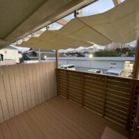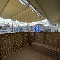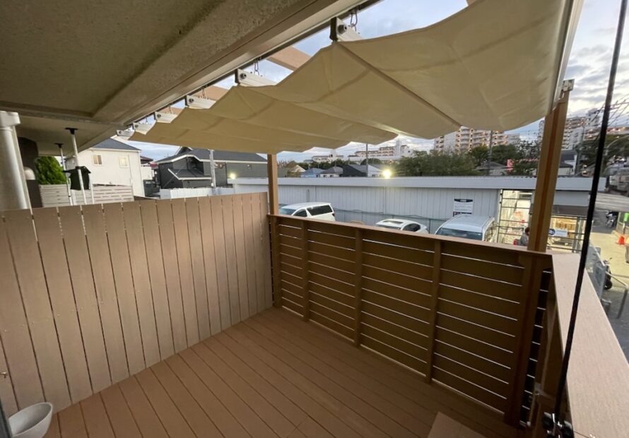 今回の施工は9月でしたがそれでも暑さは強烈でした。ウッドデッキの提案はこの暑さもいかに対策するかそこも大変重要になります。いくつかの暑さ対策、日除け方法はあるのですが最近最も多くご要望をいただくのが簡単な折り畳みオーニングです。今回もそのご要望がありテンパル社製のソラカゼを施工しました。ソラカゼの特徴は取り付けるお庭のサイズにあわせてオーダーができる事、家に直接取りける事はないので強風時に外壁を痛めることがない事、なにより簡単に軽く折り畳みできる事です。また実はウッドデッキにこの屋根に似たテント生地があると家の中のような落ち着いた空間になるのです
