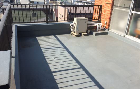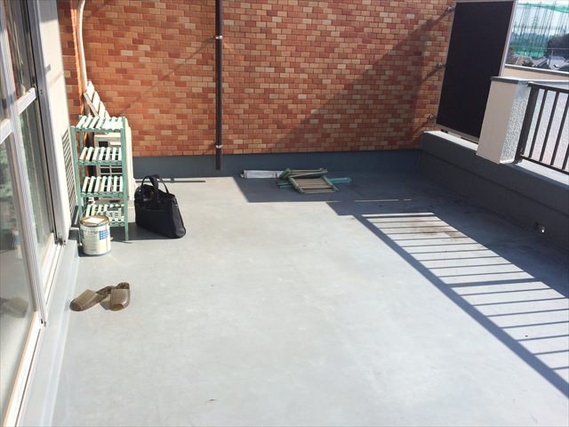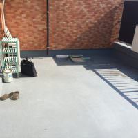 周囲に高い建物があまりないマンションのバルコニーで景色を堪能しながら、友人を呼んでくつろぐスペースをとの事でご依頼をいただきました。 約5m×3.8mと四角形の大きなバルコニーでは、広いスペースのグレー色防水層と砂埃など…..