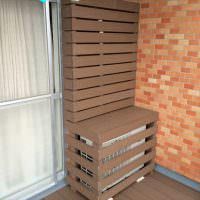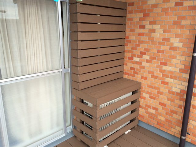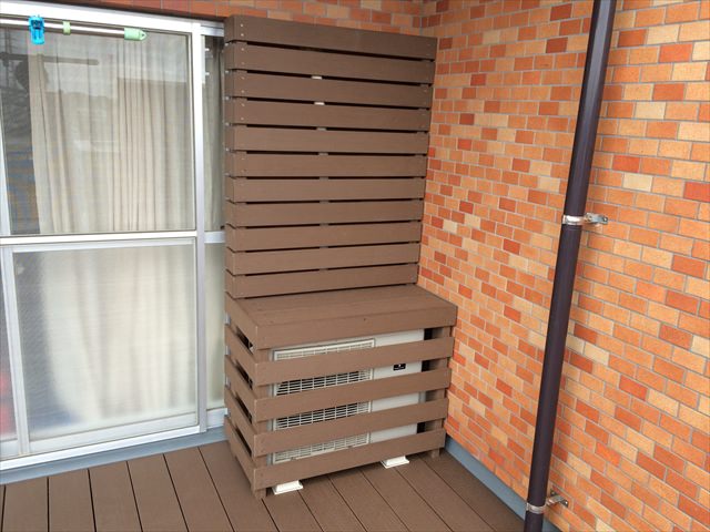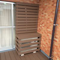 オプションの室外機カバーも同色の人工木を使い囲うことで床との統一感が取れます。色々なパターンを作成できますのでご相談ください。今回は室外機の排熱効率を下げないように隙間を詰めすぎないベースタイプとしています。