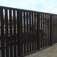 門扉から続く横幅の長いフェンスは、隙間が3センチあります。目隠しまで詰めることをせず、風抜けや防犯を考慮して決定しました。