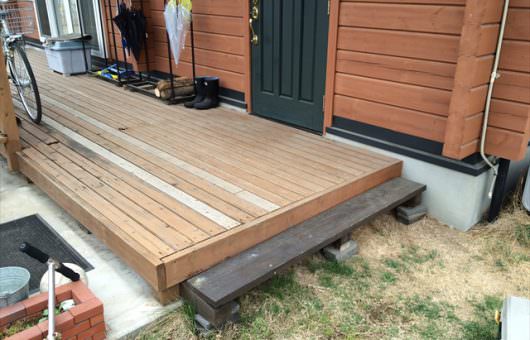 段差自体が13センチほどの低いステップを付けて、一部曲線処理をすることでゴツさをなくし優しいイメージとしています。デッキとステップの床板方向を揃えることで見た目の向上も併せています。