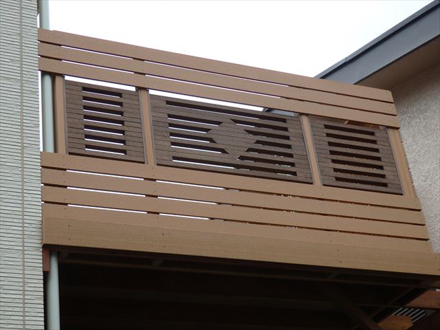 デッキとフェンスは弊社オリジナルの樹脂木アールウッドです。特にフェンスは色
