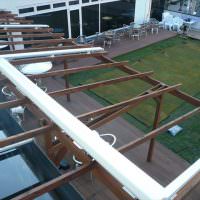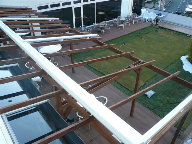 六本木のとあるビルの屋上カフェの施工例です。 広大なテラスにウッドデッキのオープンテラスを設置 雨天時も使用可能にするためパーゴラにオーニングを またカフェは当然夜も営業するので照明も多数施工。 広さは50m2以上で材質…..