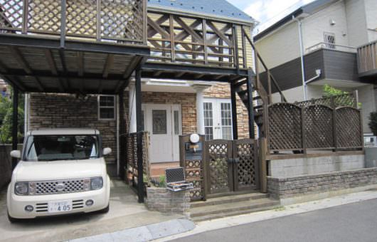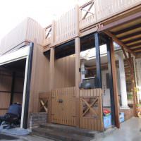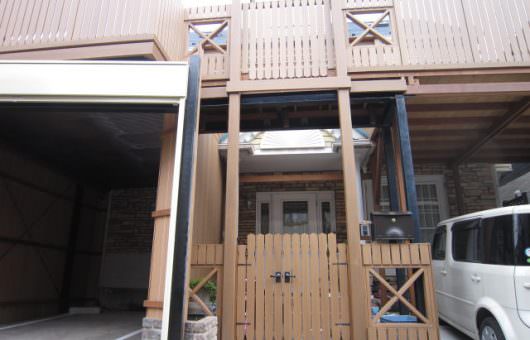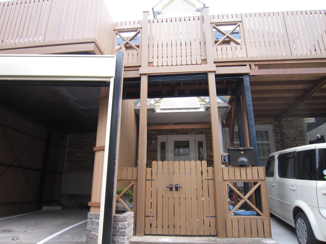 お住まいを購入するときに古いウッドデッキを撤去し、 新たにデザインしたウッドデッキ、ガレージ、門扉です。 デザインは基本的に2階まで通る太さ12cm角の通し柱に 両サイドにシンメトリーにクロスフェンスを設置。門扉はカント…..
