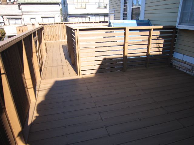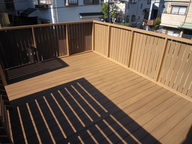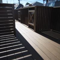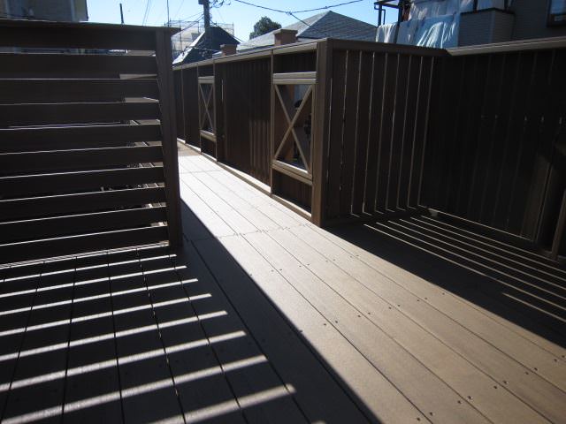 デッキとフェンスはアールウッドです。ウッドデッキは2階の渡り廊下をはさみ
