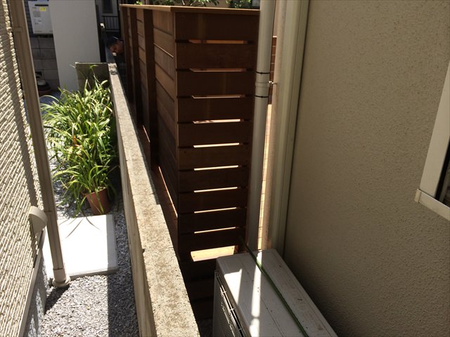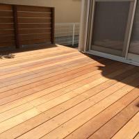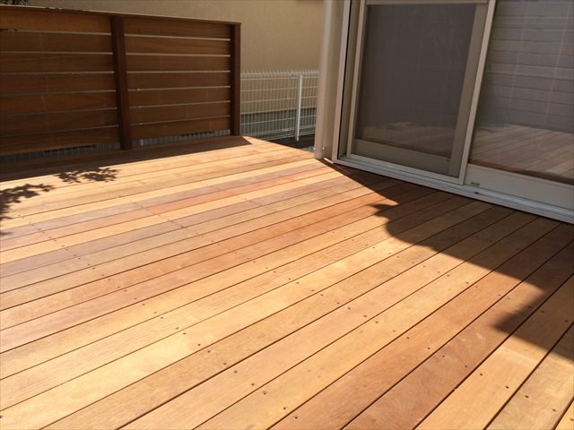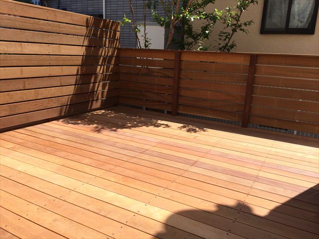 もともとのデッキは、雨風に弱い杉材を使っていたので、ハードウッドで探されていたそうです。いろいろ調べた中で、イタウバ材の肌触りがとても良かったということで、床板もフェンスもイタウバ材を使用して施工しました。
