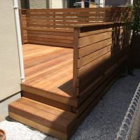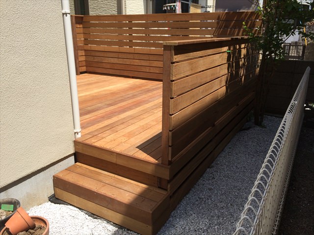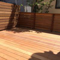住宅購入時に付いていたウッドデッキが時とともに崩れてしまい、外に出てのティータイムが取れなくなっていた施主様からのご依頼となりました。 もともとのデッキは、雨風に弱い杉材を使っていたので、ハードウッドで探されていたそうで…..