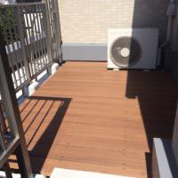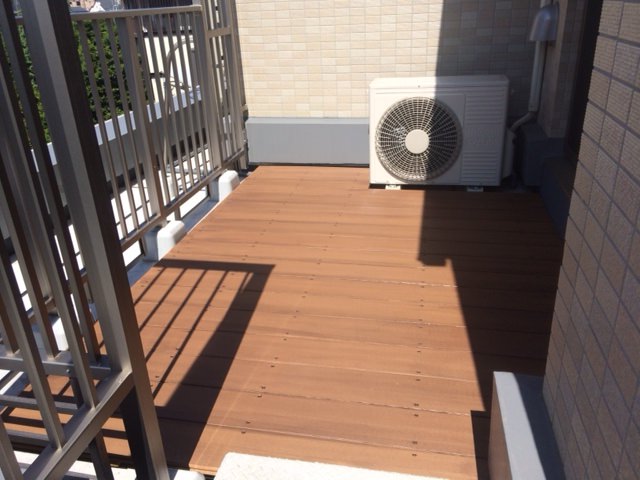 バルコニーが低い仕切り壁を挟んで2ヵ所あり、その片方の小さい方への施工ご依頼がありました。小さくてもマンションの防水加工してある独特なグレー色が見た目を寂しくしています。それを隠すように、今回のようにウッドデッキを敷き詰めることで大幅にイメージアップへとつながります。