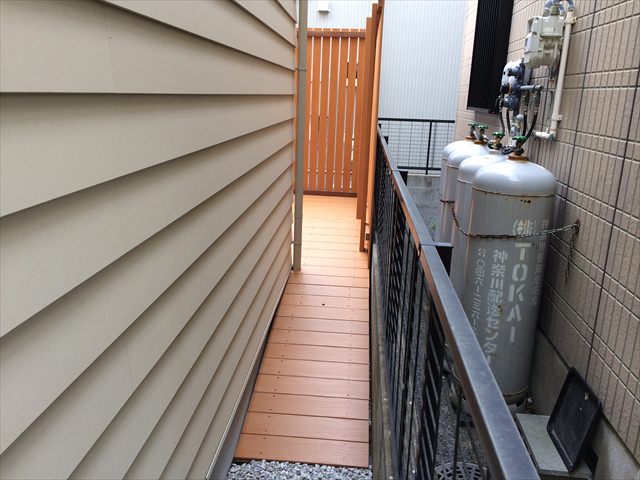 今回、家の裏側に通じる間口には、ご希望に合わせ、スロープの作成をしています。通常、ウッドデッキの床高に対して半分で1段、1/3で2段などのステップを作成して昇降しますが、スロープタイプにすることで、負担軽減のためや台車など車輪付きでもそのまま降りれたりするので便利です。ステップとは違い、着地地点までの奥行きや幅が必要になりますが、条件が揃えば作成は可能なので、選択肢の一つに挙がるアイテムです。