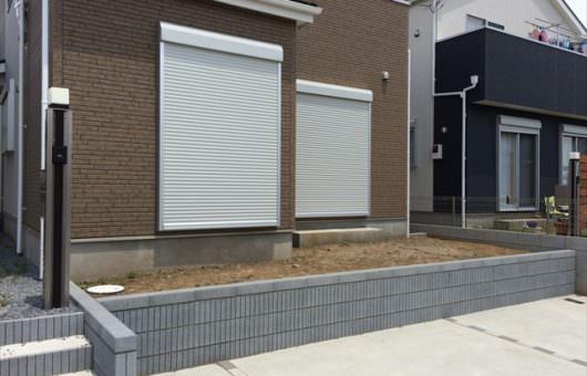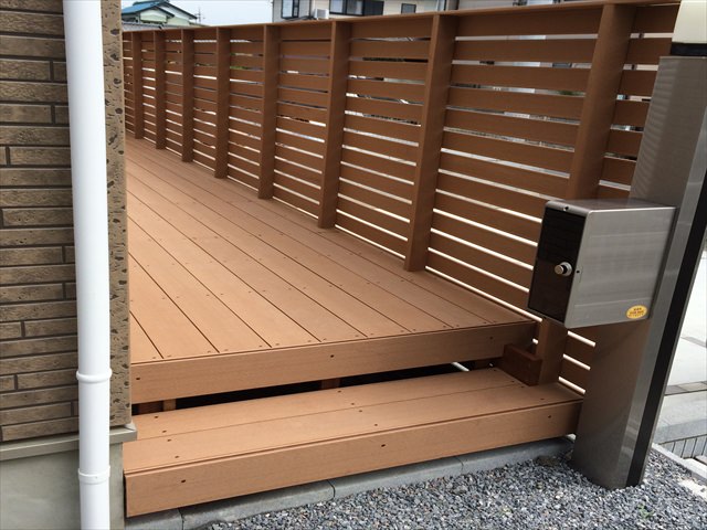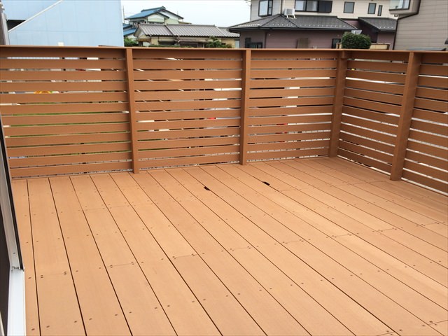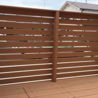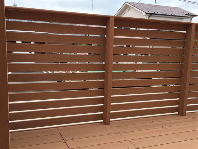 新築時からウッドデッキにする計画でたため、正面側にメッシュフェンスなどを設置していませんでした。道路からの目線遮断、デッキ上でのプライベートスペースを兼ねたものとすると、通常の落下防止フェンスより少し高めに設置することで解消できます。
