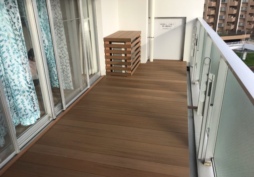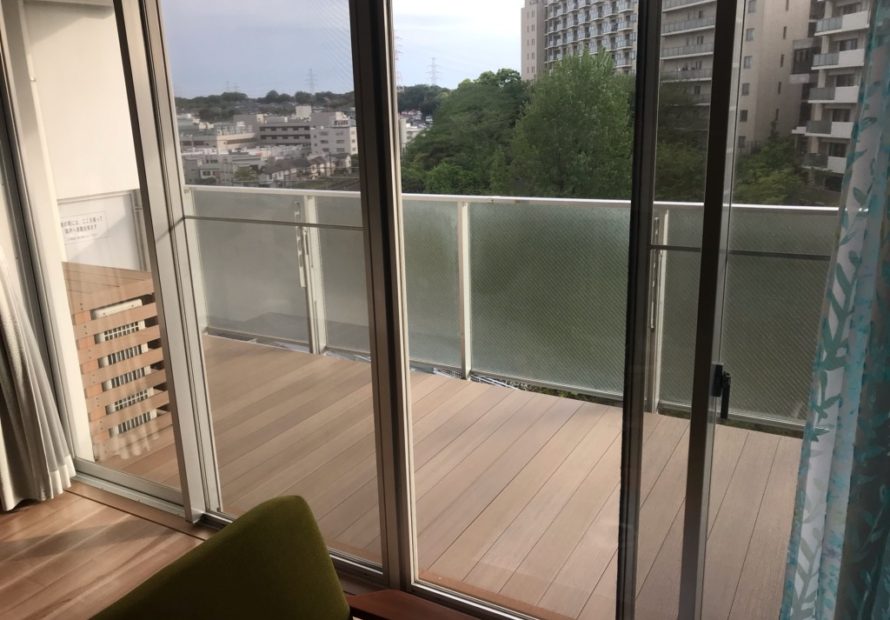 2019年4月神奈川県横浜市のマンションバルコニー施工例をご紹介します。近年の典型的な間取りのマンションの場合リビングにバルコニーが通常5mから6mのワイドで出幅が1.8mぐらいの仕様が多く見かけられます。リビングダイニングは通常16畳ぐらいでテレビの位置が確定していることからソファーなどの配置もおのずと決まってしまうようです。実は家具を置くと以外にリビングが狭く感じられるようです。そんな時ふとバルコニーをみるとグレーの防水床がかなりの面積をしめているのです。弊社とご縁のあったお客様はこの広いバルコニーをまるでリビングの延長のように激変させることができます。
