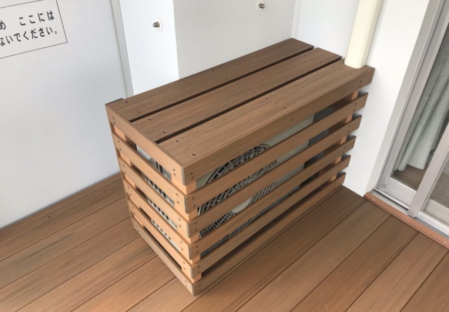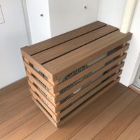 ところでマンションのバルコニーと言えば必ずあるのがエアコン室外機ですが、せっかくバルコニーを質感の高いウッドデッキにしても実はこの室外機がとても機械的で見た目が良くないとお感じにあるお客様が多いようです。その為弊社のマンションバルコニーではほとんどの方が室外機カバーの施工をご希望されます。特にリビングから見える位置に室外機がある場合はカバーがあるとないではかなり見た目に差ができてしまいます。こちらのケースは2台の室外機にカバーを作成しました。室外機カバーをもっと見えずらくできないですか?の質問が多いのですが室外機はある程度排気が重要で風が通る必要がありますのでこのようなデザインになっております。こちらの室外機カバーも当然ですがアールウッドです。