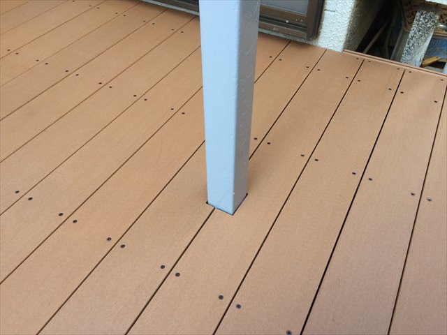 多角形でしたが、奥行きで6メートルを超えるフラットスペースができると、それだけで大きく使いやすいスペースになります。そのスペースに家の作りで2階のベランダを支える柱が立っていますが、写真で見れるように、柱の周りをカタチに合わせて切り抜くことで、違和感のない一体感を出すことができます。作り置き設置ではうまくいかないものも現場施工ならではの仕上がりです。