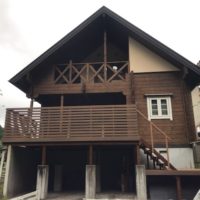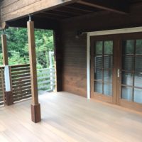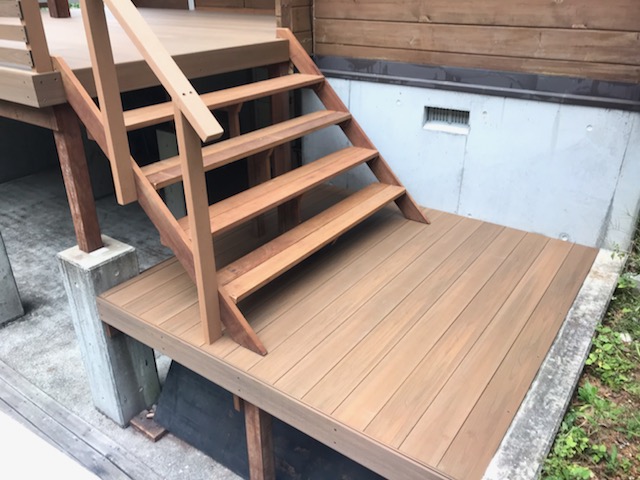 今回のご依頼は腐食したポーチデッキのリフォームでした。天然木材のログハウスと言う事でお勧めする木材は耐久性の良い天然木ハードウッドでしたが、メンテナンスや質感そして経年変化で古木化しない理由などで樹脂木アールウッドが採用されました。ログハウスに人工木材を使う?ちょと違和感がありますがアールウッドの質感はその違和感さえ感じられないクオリティーがあります。