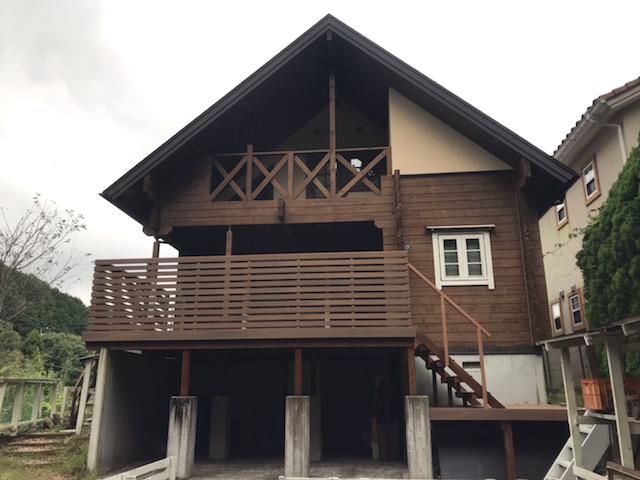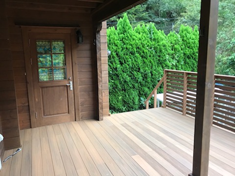 2019年9月静岡県熱海市の別荘で施工したウッドデッキのご紹介です。ログハウスと言えば別荘地では必ず見かける定番中の定番です。どっしりとした重厚な風格やふんだんに使われた木材がリゾート地の自然にマッチしているのが人気の理由のようです。ところでログハウスの主な特徴は、ほとんどの場合玄関に面するポーチはウッドデッキのポーチになっていてそこは屋根がなく雨にさらされている事です。ログハウスはもともと北欧やカナダなどの森林地帯で地場の木材(丸太)を使った建築方法で木材を無駄なく使う合理的な建物です。日本でも同じ方法を使う事は勿論可能ですが問題は日本の気候風土にあうのか?多くのログハウスのウッドデッキポーチはログハウスと同じ木材の板材つまり針葉樹を使っているようようです。