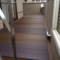 色はウォールナットで木目調仕上げもっともお客様からご注文の多い仕上げ方法です戸建てのルーフバルコニーは搬入が大変ですが、現地調査をしっかりすることで解決できます。以前は人工芝でしたがやはりアールウッドのウッドデッキは高級感があります。