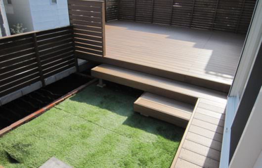 施工例は新築ご購入後、庭全体のウッドデッキを御検討されたお客様に 一部人工芝でもご提案した例です。最近の人工芝はリアルで天然芝より 実はきれいなぐらいです。さておき広いウッドデッキは約40m2あり 手すりフェンスは目隠し…..