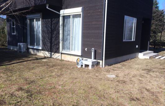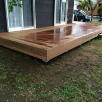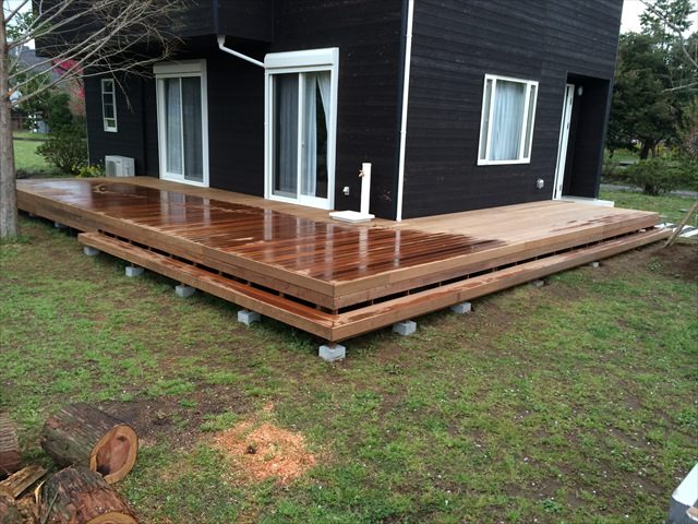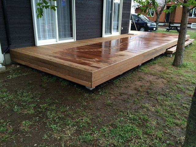 広大な敷地に9×7メートルの大きく、長くデッキを施工しました。リビングから見える樹木手前までの3メートル出幅として設定しました。その際、板向き方向をリビングのフローリング板の向きと揃えることで、室内からの景観は、樹木まで…..