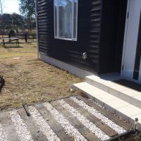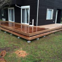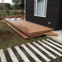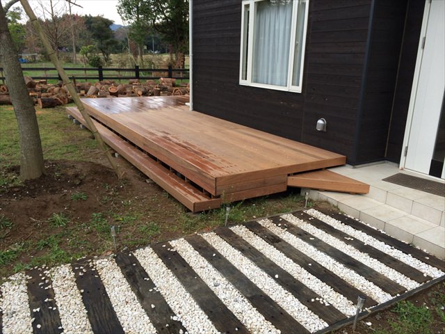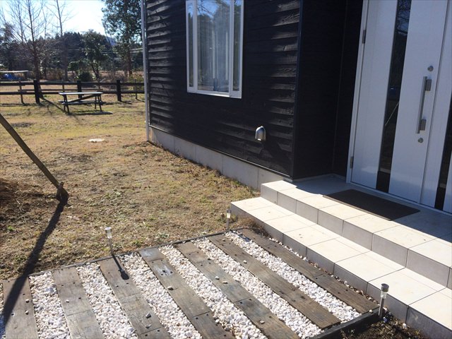玄関側には、アプローチからの移動がしやすいように、また、デッキを延長して角を出っ張らすことはせず、見た目もスッキリさせるための三角のステップを高さも平行にして設置しました。