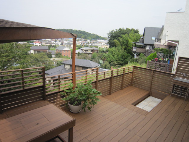 傾斜地に広大なウッドデッキを