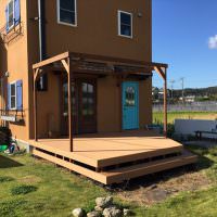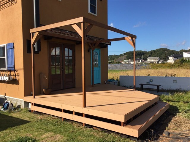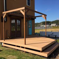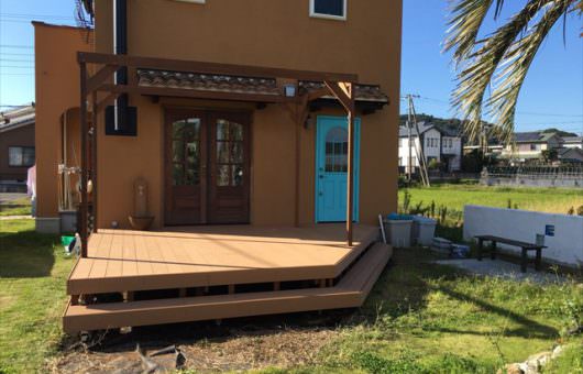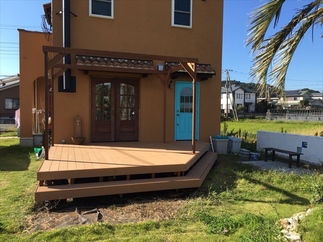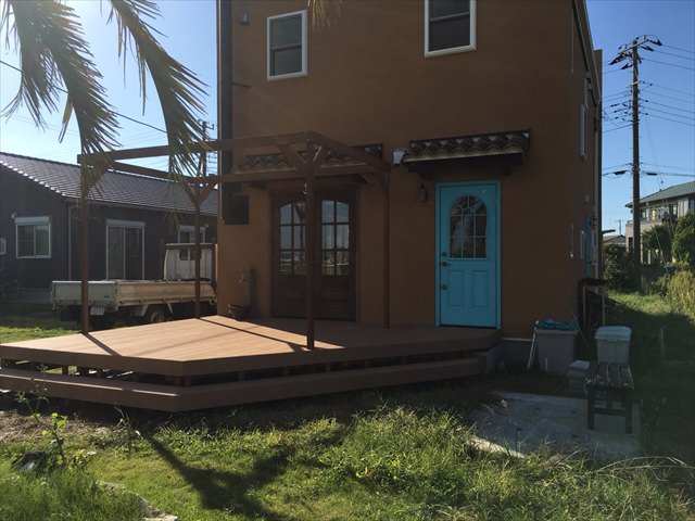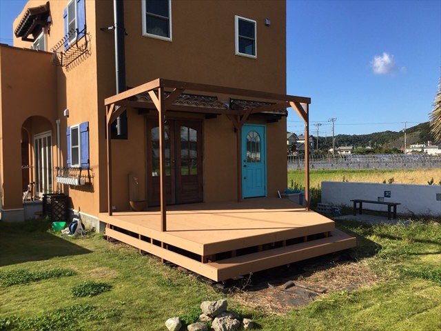 とても広い庭に4×5メートルのフラットローデッキの施工例です。親族や友人を呼んでバーベキューを行うにも十分な大きさです。外から見える風景は、ハワイなどにあるオープンステージさながら。