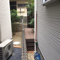 台形地の処理も得意としている弊社ホームページを観ていただき、人工木指定でご依頼をいただきました。 今回のお庭は、道路側が76センチ、奥に向かって2.3メートルまで広がる台形8.2平米のため、当初、土地の形の通りウッドデッ…..