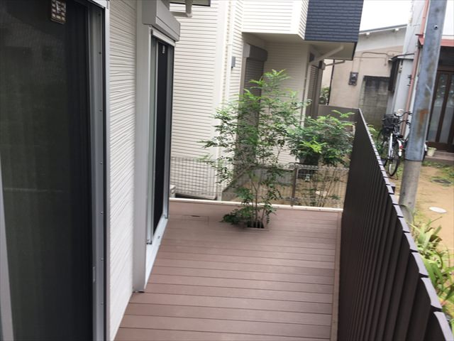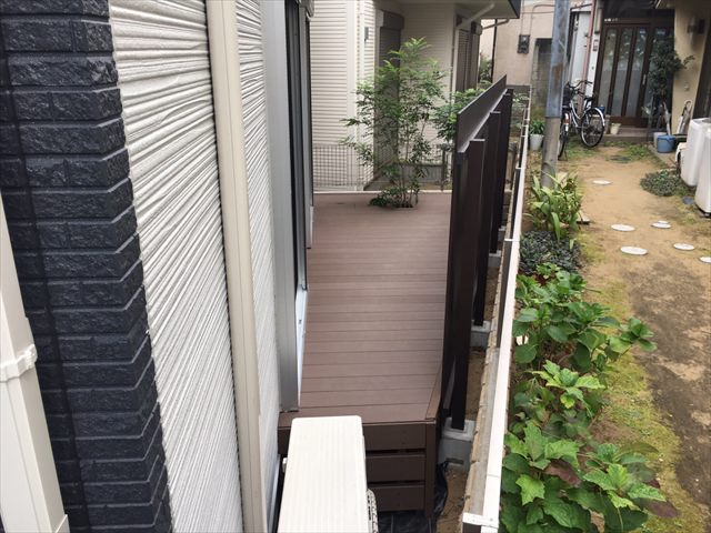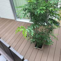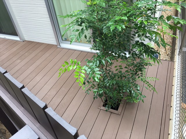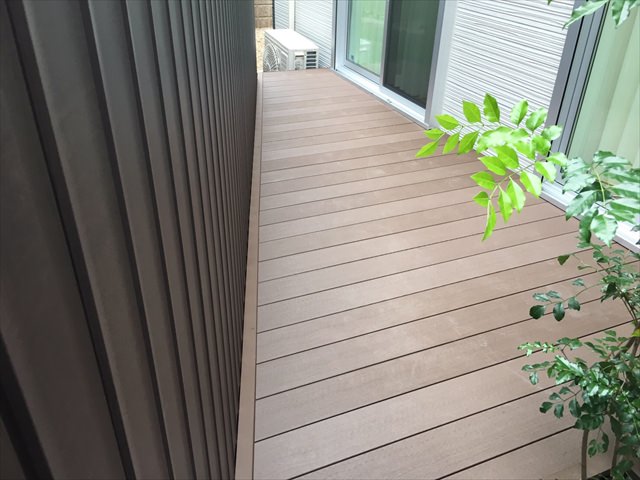 それとメンテナンス等に手間をかけずに済み、変色もない人工木は、近年とても人気があります。今回はご検討の末、シックな色合いの「ブラウン」をご選択いただきました。人の心理として足元が暗めの色を持ってくると安定感を感じるともいわれますので、シックな中にドッシリと構えているイメージとなります。それと、暗めの色なので汚れが目立たないという観点も(笑)。決して汚れないわけではないので、衛生上も含め清掃は定期的にをお勧めします。