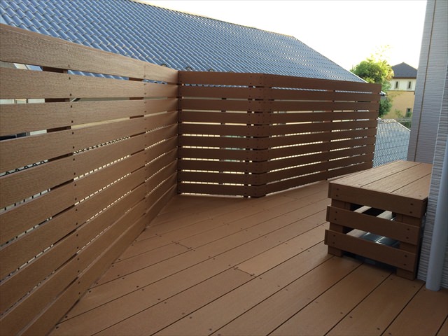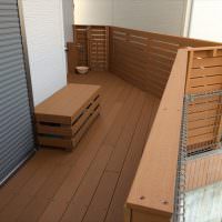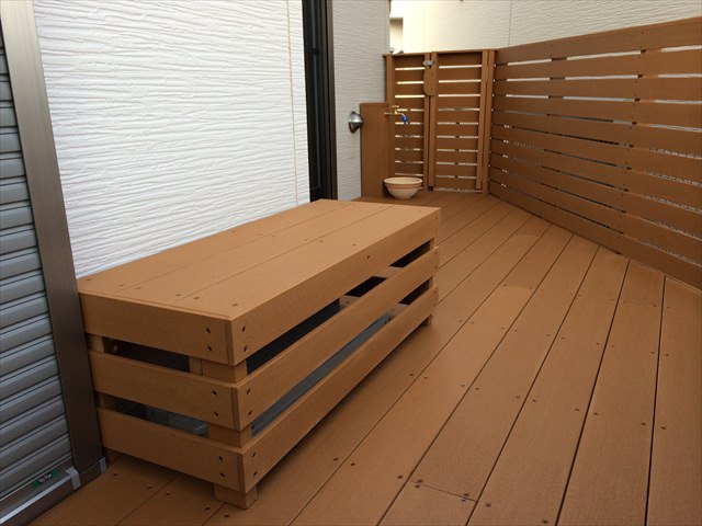 室外機をデッキ下に据え置き、その上に「室外機カバー兼ベンチ」とすることで余計なスペースを消費せずにすみます。室外機からの排熱もデッキ下に流れるので、夏場のクーラー使用による影響を軽減できます。室外機カバーベンチとフェンスとの間の実寸で1メートルありませんが、スペースを広くとれているように見えます。