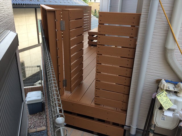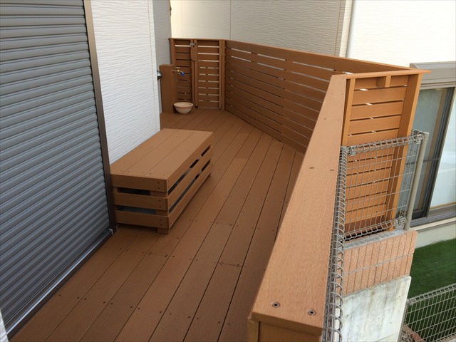 入口が90センチ弱、出幅が1.3メートルほどの庭地への施工例です。フェンス材と床板の方向を同じ向きにすることで、目線の流れを奥へ導き、広く見えるようになっています。家の中もフローリングの向きが同じ方向を向いているので、相…..
