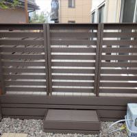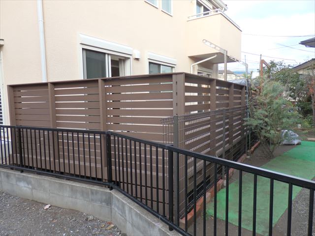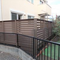 境界が斜めで変形しているがその形状のウッドデッキとフェンスを
