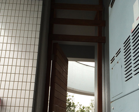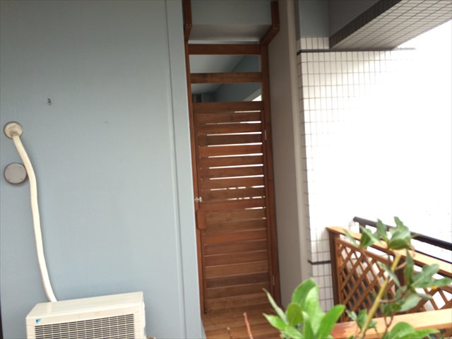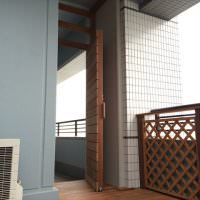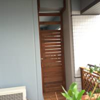 特注品としては、部屋から見える部分の柱壁を隠すラティスフェンスと反対側の通路に作った風除けを兼ねた扉の作成です。マンションの壁などに穴あけ・留め加工ができないため、木で枠を組み上げて、柱や梁につっかえ棒として加工した物を使用しています。扉は枠や横板などもすべてウリン材を使用しているので、自重は重い部類ですが、キャスターを付けることで開閉は問題ありません。