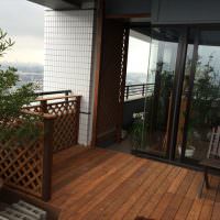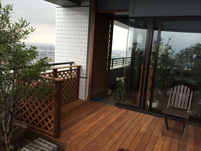 「特例」のマンションバルコニーデッキの施工例を紹介します。これだけの大きなウッドデッキと扉などを作成する場合、マンション管理側に申請をして許可が下りた場合のみ可能だからです。ご存知の通り、バルコニーやベランダは、占有していても避難経路などの共用部であるため、ほぼ申請が必要になっています。弊社でも「管理組合側から許可が下りない」などの理由でキャンセルがあるほどです。マンションバルコニー・ベランダでも許可が下りると可能なので、参考にしてください。