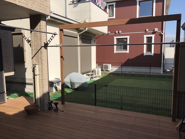 各辺4メートルを超える広い中庭へのウッドデッキを設置となりました。 庭の活用や部屋から庭奥にある物置までの導線等々をふまえた使い勝手を考えると 選択肢「ウッドデッキ」は有効です。 以前にも全面ではないウッドデッキがあった…..