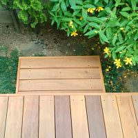 ステップも通常では出幅を小さくして庭のスペースをつぶさないよう配慮していますが、今回は踏み板枚数を増やして、足をつきやすく昇降が少しでも楽になるようにすることに重点を置いて施工しています。