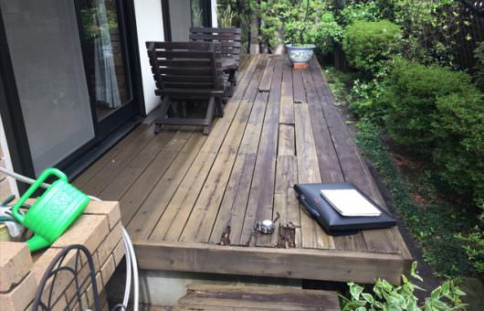 ひと昔前に施工した既存のウッドデッキが、経年とともに朽ちてきて、デッキはおろか庭に出ようとする際にも危険を感じるようになったので、「作り替えよう」とリフォームを決意した大田区の施主様からご依頼をいただきました。