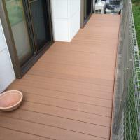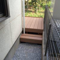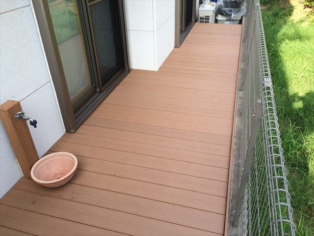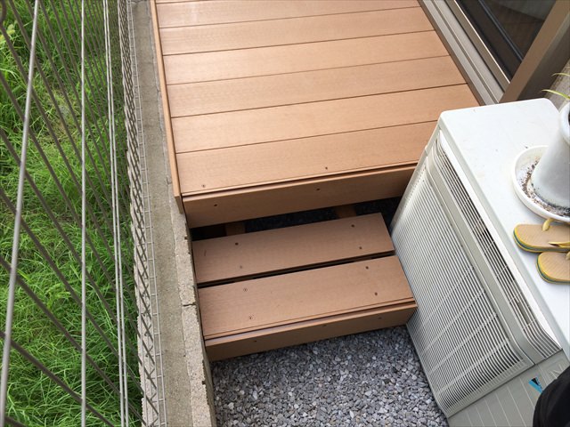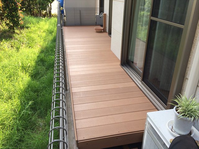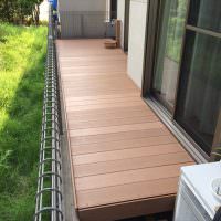 床板はウリンと人工木材で悩まれていましたが、ささくれの件が気になられ、人工木材のベージュ色を選択いただきました。床板方向は、フローリングと同じ向きに合わせて施工したことで、部屋側から見ると広くなった錯覚になると思います。