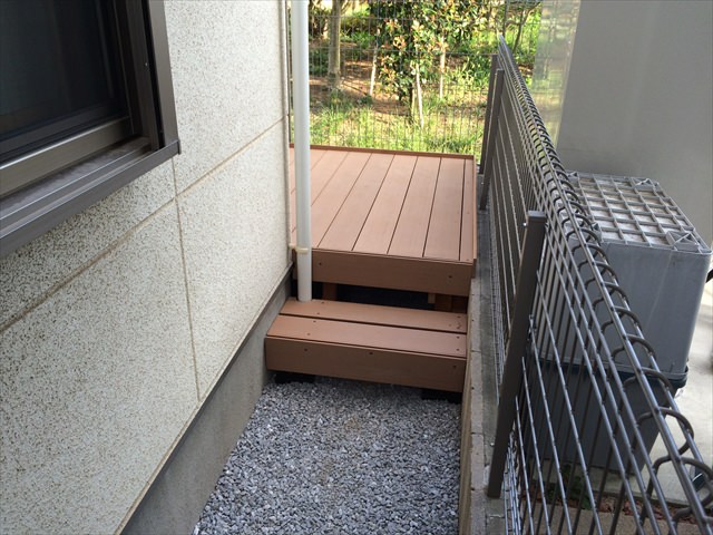 近隣・周囲の環境が良いためフェンス等々は必要なく、床と段差を減らすステップとのご要望でした。そのほか水洗をデッキの上で使えるようにしてほしいとの事でしたので、延長工事も施しました。排水受け鉢を小ぶりなテラコッタを使うことで、雰囲気の統一感を狙いました。