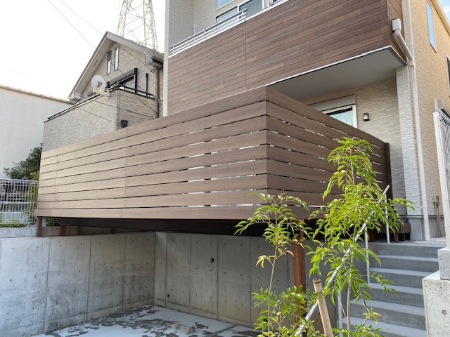 2019年10月神奈川県川崎市で駐車場ハイデッキの施工事例です。施主様はお住まいの新築計画の時点で弊社展示場にご相談に訪れました。駐車場デッキなどの大型物件の場合は新築からご計画される方が多くまだ更地の段階から図面などをもとにデザインや概算見積もりを作成していきます。今回のケースも施工より約半年前より打合せして現地調査や展示場で色やデザインなどを確認していただき最終的に施工にいたりました。