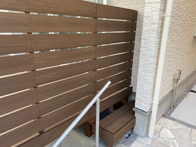 弊社では新築時のウッドデッキをご提案する時にお住いのパースなども参考にプランを作成しております。今回のケースでも家の外観にオールナットの木目調サイディングが使用されておりましたので弊社の提案もオールナットの人工木アールウッドになりました。駐車場ウッドデッキは家の真ん前にあり存在感は大きいので家に合わない奇抜なデザインは避けるべきとも考えられます。こちらの施工例はサイデイング壁とウッドデッキの手すりフェンスがマッチングして違和感が全くないデザインになりました。ウッドデッキもオールナットにしたので白い外壁と相まって高級感のあるデザインになりました。