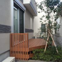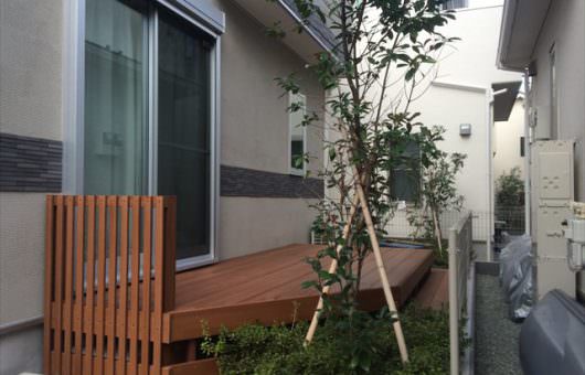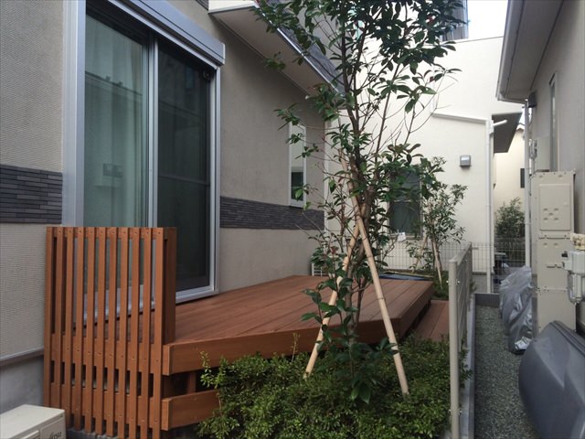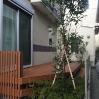 ウッドデッキと残した植栽の調和がうまくとれています。