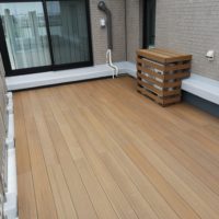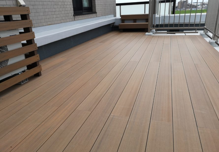 マンションルーフの無機質な防水床がまるで天然木材の美しい木目調のウッドデッキに生まれ変わりました。